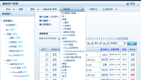 如需要将某些邮箱账号归入某些部门,除在编辑邮箱账号属性时可以修改,还可以直接在列表中选择需要修改的邮箱帐号,点击“转移到”,如图21。