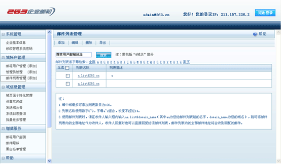 点击左侧菜单<域帐户管理>下的<邮件列表管理>,进入邮件列表页面,如图30,在此界面中可以完成邮件列表的添加、修改、删除等功能。