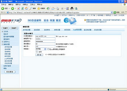 用户名和用户密码分别填入实际资料,可以选择"在pop服务器上保留邮件",然后选择页面右侧的"是否生效";这样可以使用商务邮箱收取其他邮箱(比如新浪、163邮箱)的信件(此功能也可在客户端软件中实现,请参考outlook设置部分);